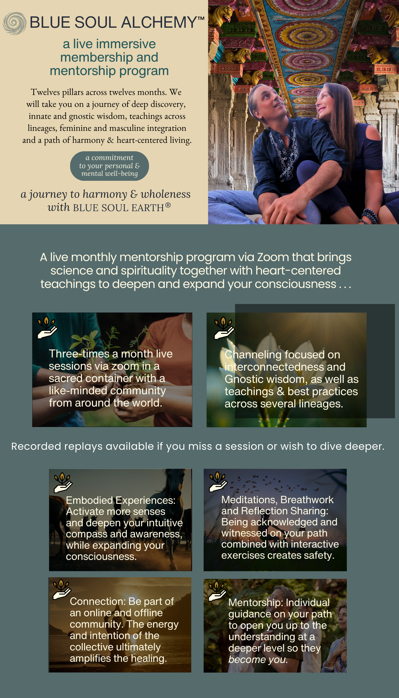 Blue Soul Alchemy™ serves as a hybrid model of both our Blue Soul MASTERS and monthly memberships. Mentorship is part of our ongoing meetings, as are teachings, energy transmissions, exercises, breathwork, guided meditations, break-out sessions, sharing and support through a dynamic and heart-centered community.