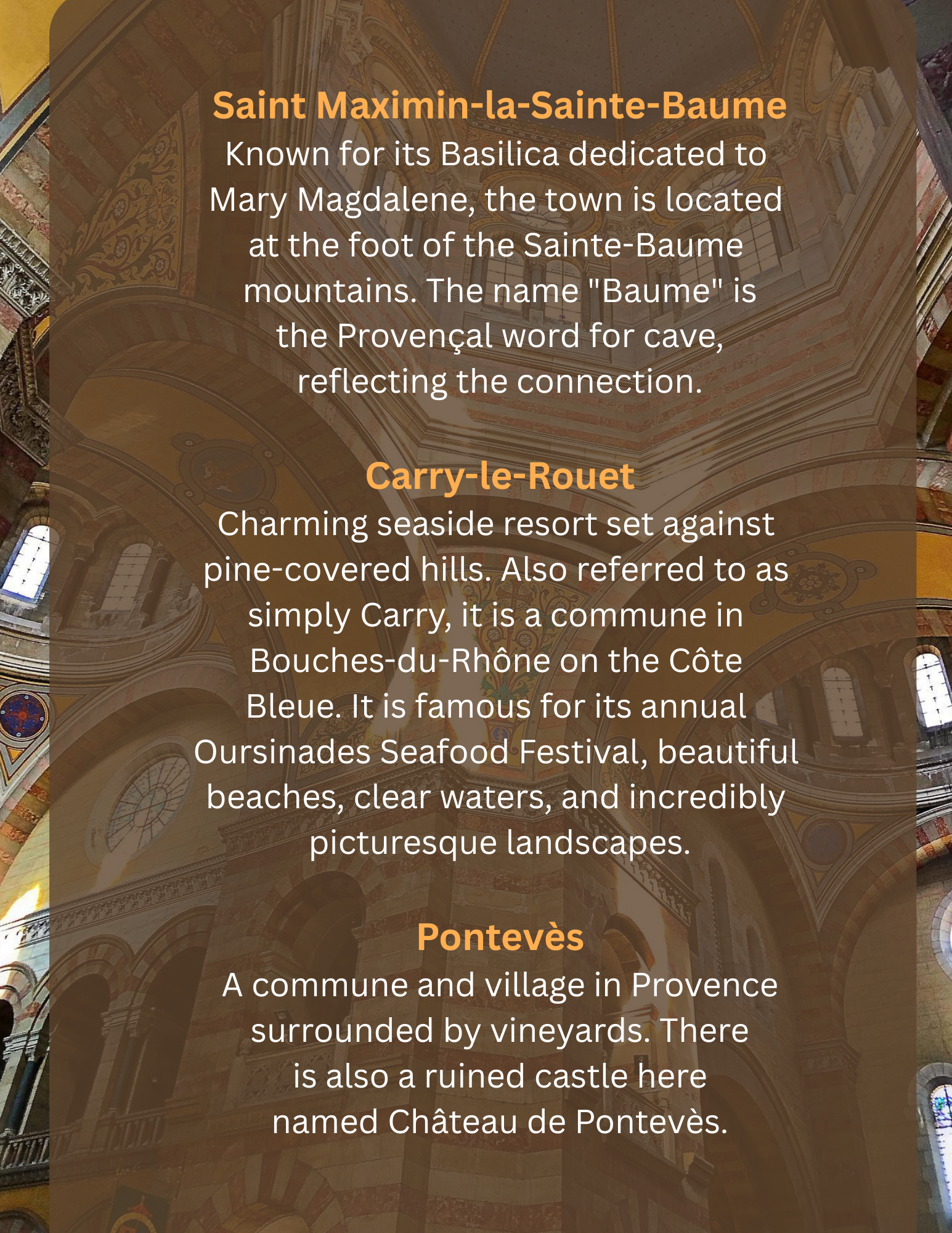Some of the planned site visits will include various temples, cathedrals and palaces in coastal Marseille, Aix-en-Provence, Saint Maximin-La-Sainte-Baume where Miriam and the sisters once taught (both the town and the caves), Pontévès, Cotignac, Cassis, Carry-le Rouet, a vineyard: TBD, and more (itinerary is subject to change and be fine-tuned as we get closer to the retreat date).