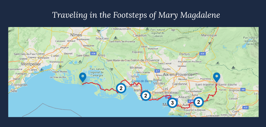 We will not be taking the route below; however, we share it with you to give you an idea of what is seen as a traditional path. That said, we are including some of these visits. We are being guided by the Magdalene energy; the shape and form it will take is subject to something outside of our structured and linear thinking. Magdalene is guiding us to spend more quality time on the Eastern side of this route, focusing on sacred ritual, ceremony, nature and side trips off the beaten path to absorb some of the cultural aspects of Provence as well. As she, Yeshua and other ancient wisdom teachers and masters have taught: balance, balance, balance.