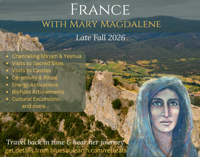 October/November 2026: Join us for a wild adventure through the Cathars region of France. Refusing the Old Testament, the authority of the Pope and the Catholic church, Catharism was a dissident religion that stirred up south-western France until the mid-18th century. Siege warfare and battles of nerves took place in Toulouse and the Pyrénées. Some of the sacred sites we'll take in include Carcassonne, Five Sons, as well as the chateaus of Lastours, Fontfroide Abbey, Saint-Hilaire, and Foix Chateau. (Schedule not finalized yet, so subject to change). Interested in coming along for a transformative experience with Mary Magdalene, Yeshua and the guides? Channeling, a Darshan activation, time in nature, ceremony and ritual will all be part of the Pilgrimage. Email us at info at bluesoulearth dot com if you're interested in joining us or to secure your spot. (NOTE: we are shooting for the last week of October into possibly the first few days of November 2026 but haven't nailed down exact dates yet).