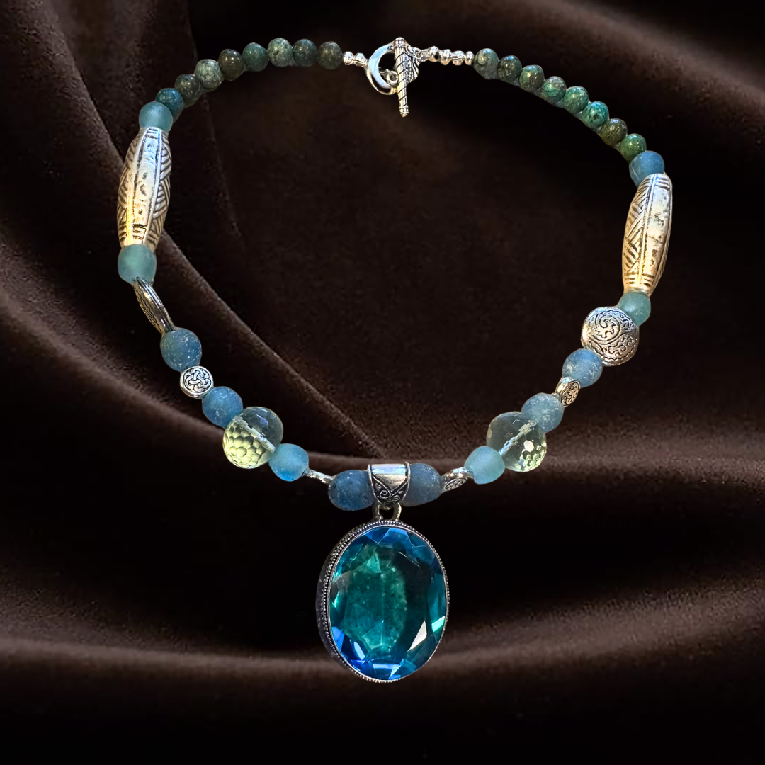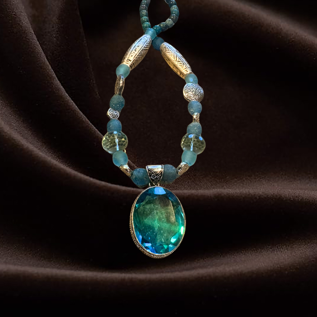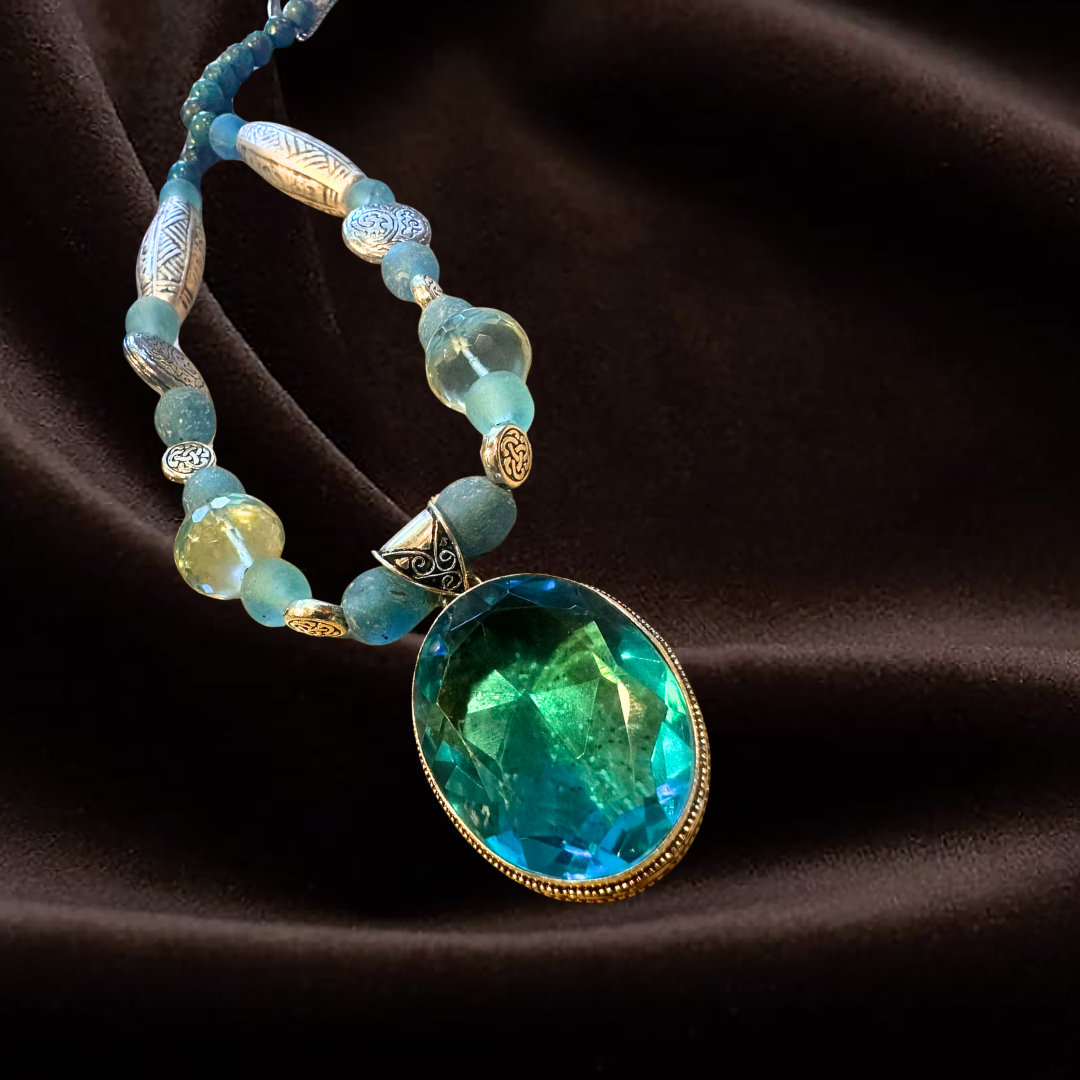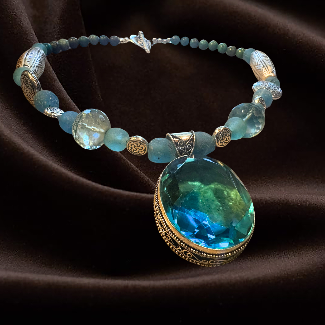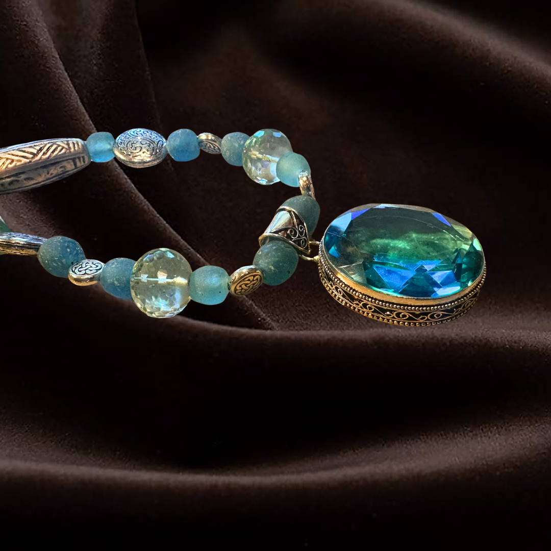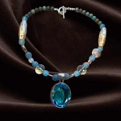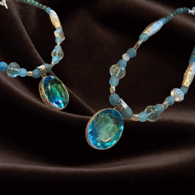 Lemuria is known as a so-called lost continent, and although history can’t confirm its existence, Lemuria remains a popular idea in the spiritual community. It is often described as a lost paradise or the ancestral home of humanity, but even more, some people say they remember experiences from past lives in Lemuria. Whether this is a myth, legend, or there’s some truth to it, the magic and wonder of Lemuria bring special qualities. The air and water were believed to be clean, clear, and crystal blue, like the mesmerizing blue glass of this beautiful heart pendant. Allow this piece to remind you of your own light, wisdom, and clarity—be the beacon you already are, step into your power, and speak your truth.