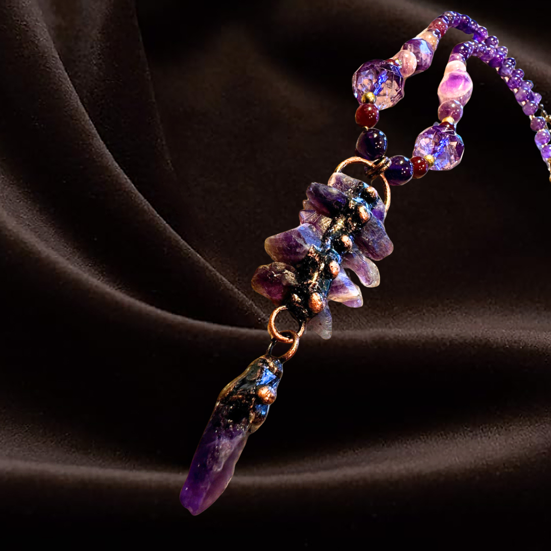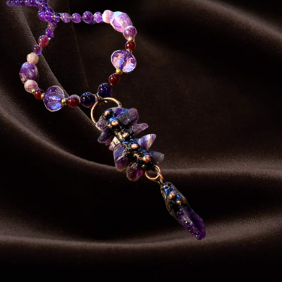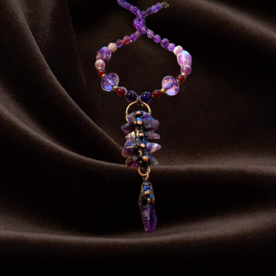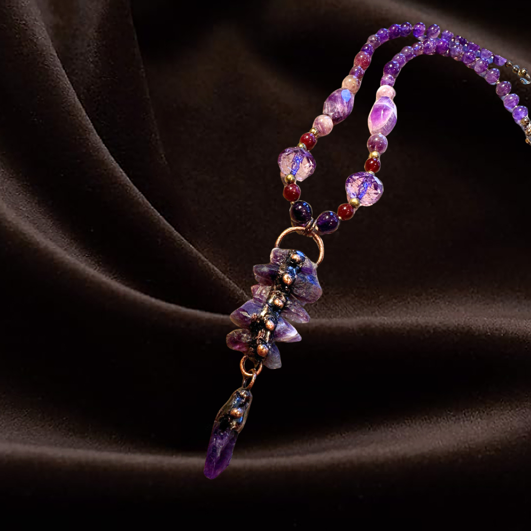 Purple Soaring Fly captures a sense of graceful transformation, centered around a delicate dragonfly pendant—long regarded as a symbol of change, adaptability, and the lightness of being. The pairing of amethyst and garnet creates a beautiful energetic balance: amethyst, with its soft violet tones, is often associated with clarity of mind, intuition, and a calming, protective presence, while garnet’s deep red hues are linked to vitality, grounding, and the quiet strength of the heart. Together, these stones evoke the feeling of rising above challenges while remaining deeply rooted within oneself, making this piece feel both uplifting and stabilizing. Worn close, it carries an essence of spiritual growth and personal evolution, like a gentle reminder to trust the process of becoming.