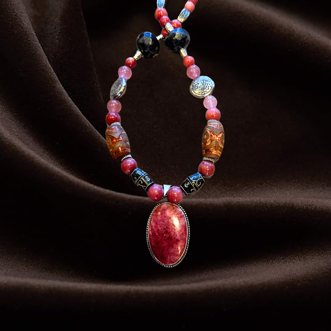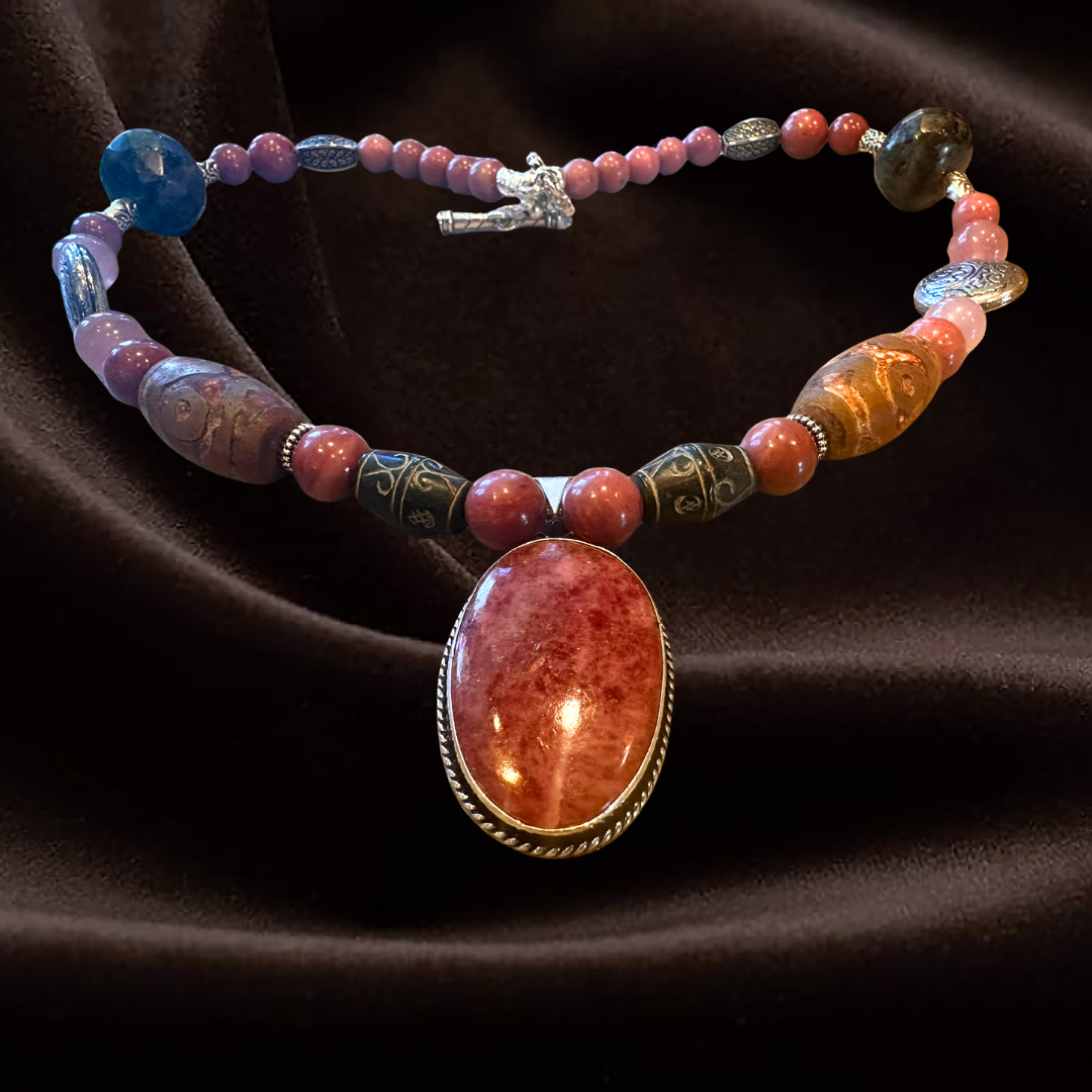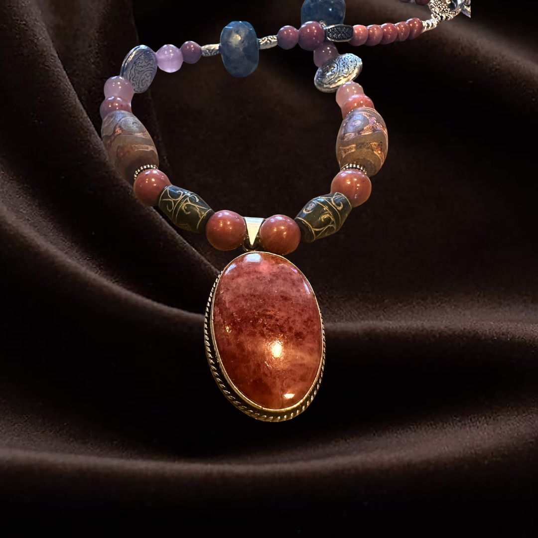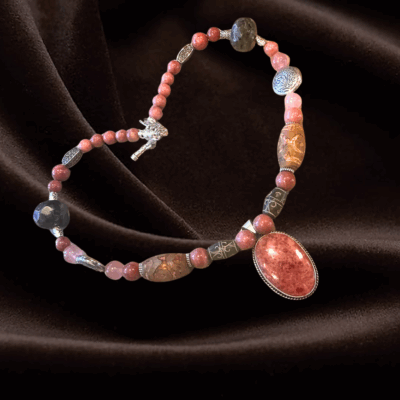 Pink symbolizes heart-centered living, the heart chakra, and love. We combine Rhodonite, Tourmaline, and Strawberry Quartz to infuse these beautiful, loving energies, mingling them with Old Jade for its antiquity, wisdom, and ancient esoteric knowledge. This is also a creative piece, serving as a reminder that you have new creative ideas waiting to be brought to life. Let the energy of this mesmerizing necklace ignite your inspiring and creative spirit. It’s time for you to introduce more innovative ideas into the world.
