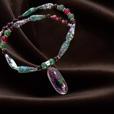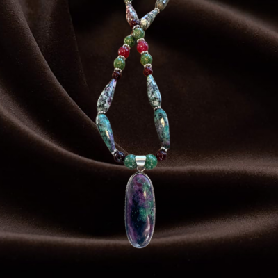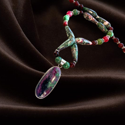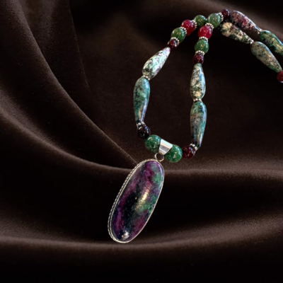 This vibrant necklace features a ruby zoisite pendant alive with natural contrast, where deep ruby tones are interwoven with lush green zoisite, symbolizing the union of vitality and growth. The surrounding beads of jade bring a soft, calming green that has long been linked to balance and harmony, while garnet adds a touch of boldness and grounding energy. The additional ruby zoisite beads echo the pendant’s organic beauty, tying the piece together with a sense of natural rhythm and movement. Altogether, it offers a feeling of renewal and strength, ideal for someone drawn to both transformation and stability.