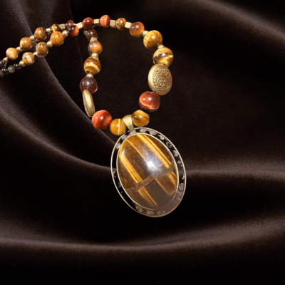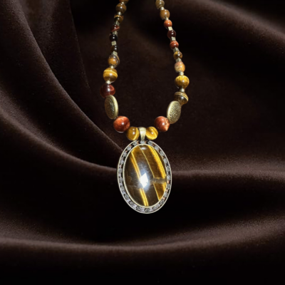The Brown Tiger carries a grounded, confident presence, anchored by a warm tiger’s eye pendant that shimmers with bands of golden and russet light. Paired with deep red tiger’s eye and the smooth, inky depth of onyx, the piece feels both steady and quietly powerful, like a calm strength that doesn’t need to announce itself. Tiger’s eye has long been associated with clarity, courage, and forward movement, while onyx is often seen as a stone of protection and inner stability. Together, they create a sense of centered resilience—something that feels reassuring when worn close, as though it gently steadies your energy while encouraging you to move through the world with confidence and intention.